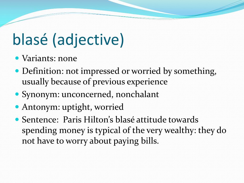 blasé (adjective) • Variants: none • Definition: not impressed or worried by something, usually because of previous experience • Synonym: unconcerned, nonchalant • Antonym: uptight, worried • Sentence: Paris Hilton’s blasé attitude towards spending money is typical of the very wealthy: they do not have to worry about paying bills.