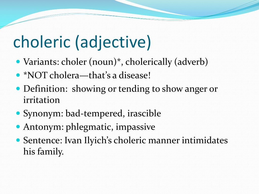 choleric (adjective) • Variants: choler (noun)*, cholerically (adverb) • *NOT cholera—that’s a disease! • Definition: showing or tending to show anger or irritation • Synonym: bad-tempered, irascible • Antonym: phlegmatic, impassive • Sentence: Ivan Ilyich’s choleric manner intimidates his family.
