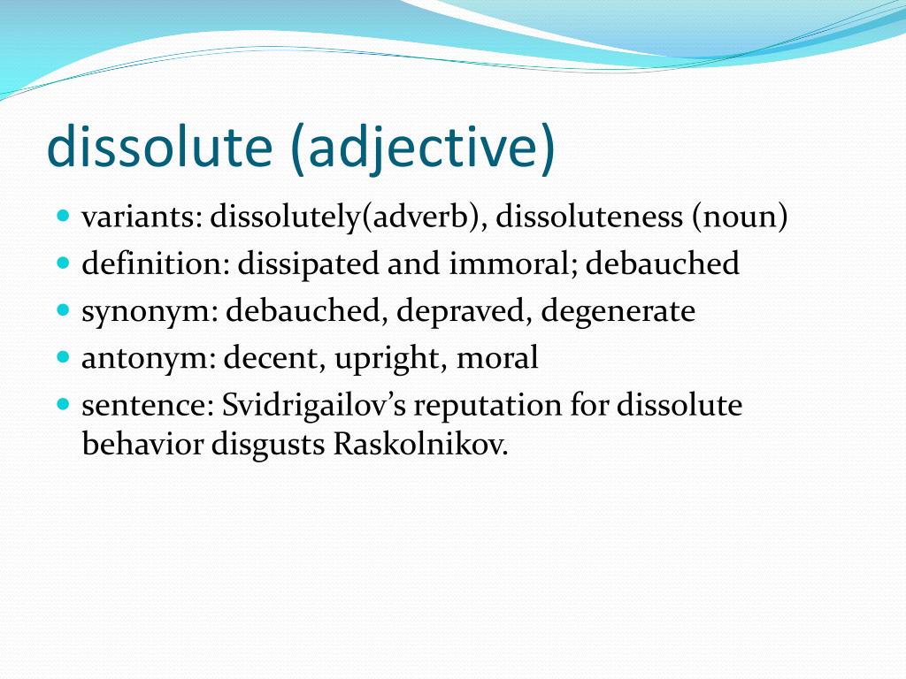 dissolute (adjective) • variants: dissolutely(adverb), dissoluteness (noun) • definition: dissipated and immoral; debauched • synonym: debauched, depraved, degenerate • antonym: decent, upright, moral • sentence: Svidrigailov’s reputation for dissolute behavior disgusts Raskolnikov.