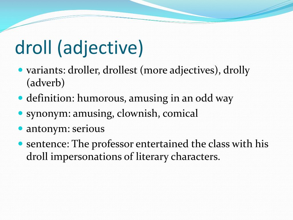 droll (adjective) • variants: droller, drollest (more adjectives), drolly (adverb) • definition: humorous, amusing in an odd way • synonym: amusing, clownish, comical • antonym: serious • sentence: The professor entertained the class with his droll impersonations of literary characters.