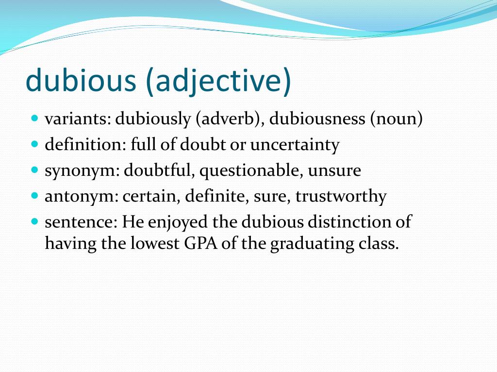 dubious (adjective) • variants: dubiously (adverb), dubiousness (noun) • definition: full of doubt or uncertainty • synonym: doubtful, questionable, unsure • antonym: certain, definite, sure, trustworthy • sentence: He enjoyed the dubious distinction of having the lowest GPA of the graduating class.