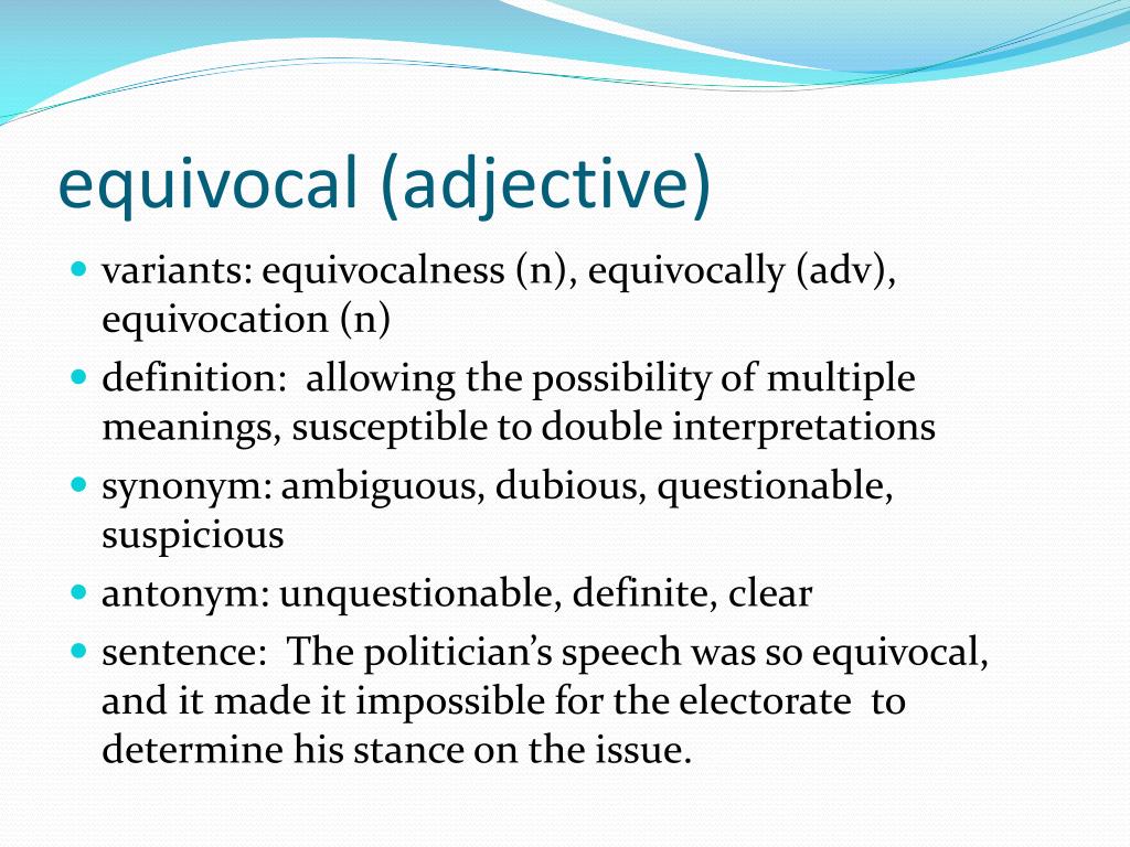 equivocal (adjective) • variants: equivocalness (n), equivocally (adv), equivocation (n) • definition: allowing the possibility of multiple meanings, susceptible to double interpretations • synonym: ambiguous, dubious, questionable, suspicious • antonym: unquestionable, definite, clear • sentence: The politician’s speech was so equivocal, and it made it impossible for the electorate to determine his stance on the issue.