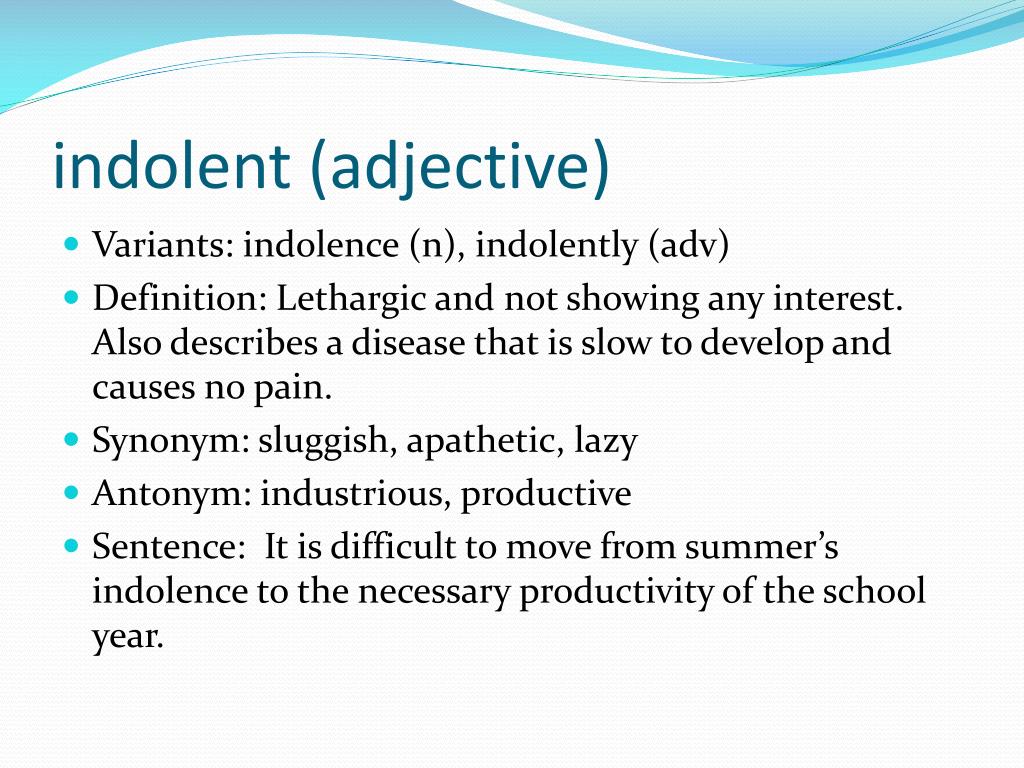 indolent (adjective) • Variants: indolence (n), indolently (adv) • Definition: Lethargic and not showing any interest. Also describes a disease that is slow to develop and causes no pain. • Synonym: sluggish, apathetic, lazy • Antonym: industrious, productive • Sentence: It is difficult to move from summer’s indolence to the necessary productivity of the school year.