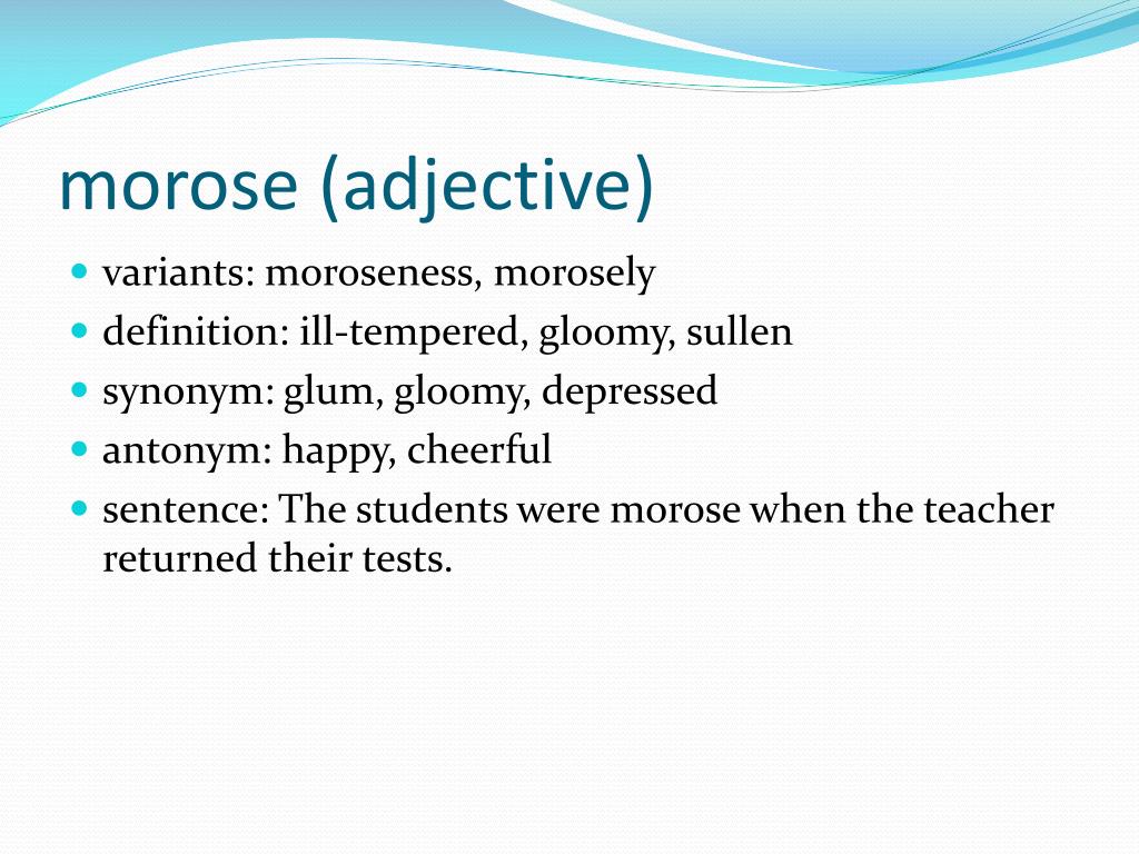 morose (adjective) • variants: moroseness, morosely • definition: ill-tempered, gloomy, sullen • synonym: glum, gloomy, depressed • antonym: happy, cheerful • sentence: The students were morose when the teacher returned their tests.
