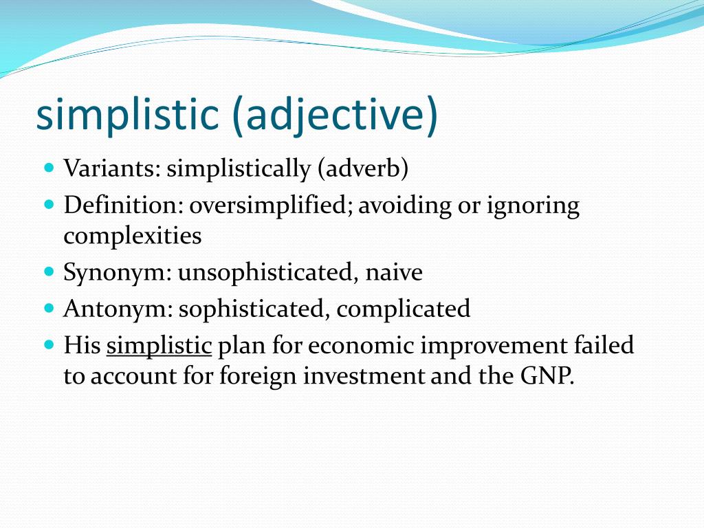 simplistic (adjective) • Variants: simplistically (adverb) • Definition: oversimplified; avoiding or ignoring complexities • Synonym: unsophisticated, naive • Antonym: sophisticated, complicated • His simplistic plan for economic improvement failed to account for foreign investment and the GNP.