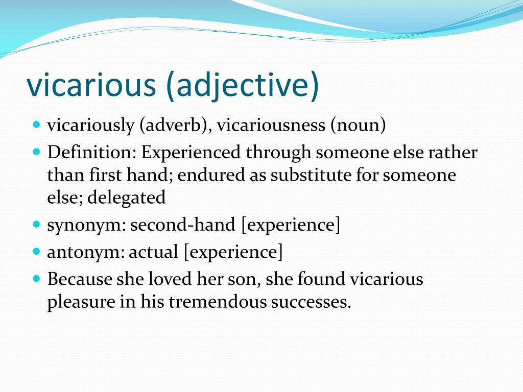 vicarious (adjective) • vicariously (adverb), vicariousness (noun) • Definition: Experienced through someone else rather than first hand; endured as substitute for someone else; delegated • synonym: second-hand [experience] • antonym: actual [experience] • Because she loved her son, she found vicarious pleasure in his tremendous successes.