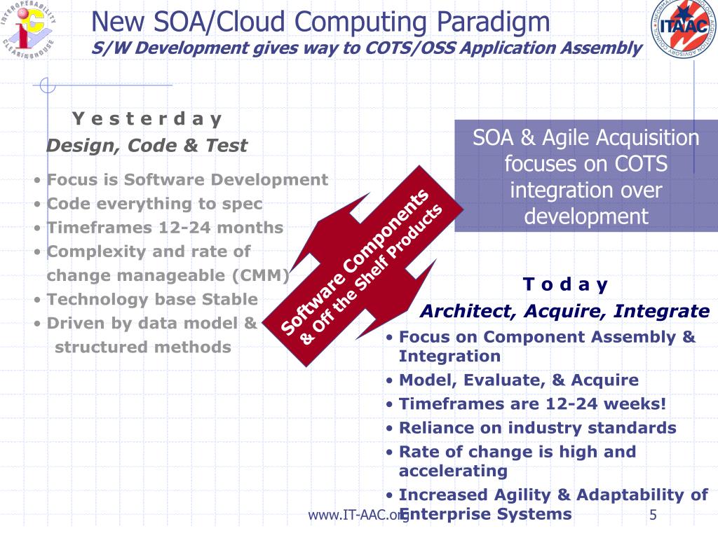 New SOA/Cloud Computing ParadigmS/W Development gives way to COTS/OSS Application Assembly Y e s t e r d a y Design, Code & Test SOA & Agile Acquisition focuses on COTS integration over development • Focus is Software Development • Code everything to spec • Timeframes 12-24 months • Complexity and rate of change manageable (CMM) • Technology base Stable • Driven by data model & structured methods Software Components & Off the Shelf Products T o d a y Architect, Acquire, Integrate • Focus on Component Assembly & Integration • Model, Evaluate, & Acquire • Timeframes are 12-24 weeks! • Reliance on industry standards • Rate of change is high and accelerating • Increased Agility & Adaptability of Enterprise Systems www.IT-AAC.org