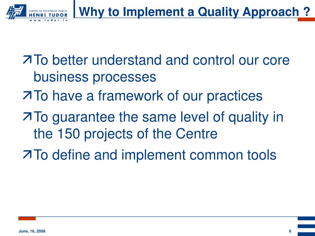 Why to Implement a Quality Approach ? • To better understand and control our core business processes • To have a framework of our practices • To guarantee the same level of quality in the 150 projects of the Centre • To define and implement common tools