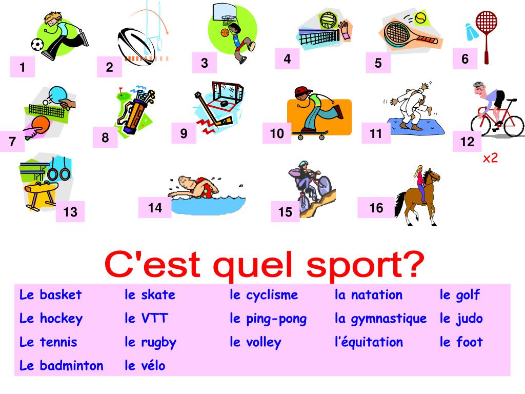 4 6 3 5 1 2 9 10 11 8 7 12 x2 14 16 13 15 C'est quel sport? Le basket le skate le cyclisme la natation le golf Le hockey le VTT le ping-pong la gymnastique le judo Le tennis le rugby le volley l’équitation le foot Le badminton le vélo