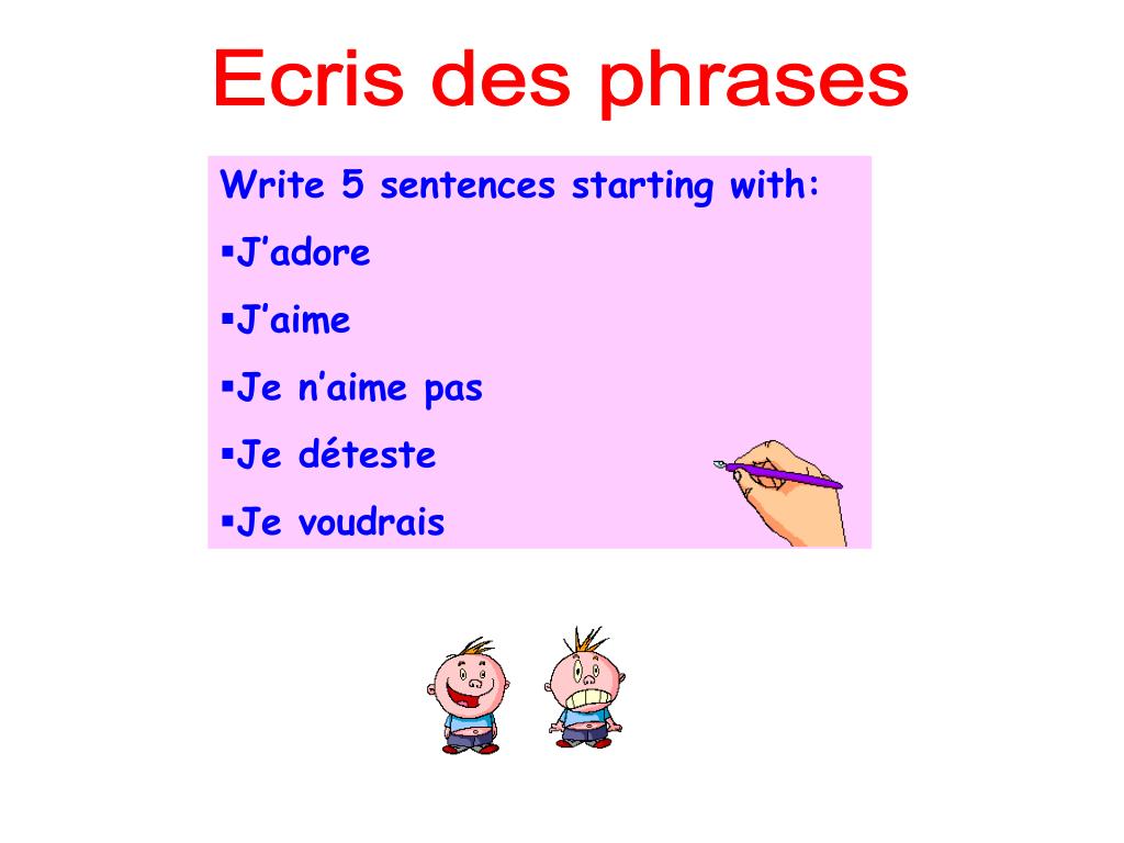 Ecris des phrases • Write 5 sentences starting with: • J’adore • J’aime • Je n’aime pas • Je déteste • Je voudrais