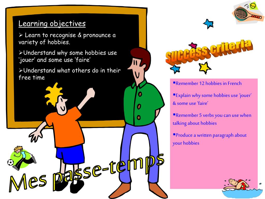 Can you remember how to say 12 different hobbies in French? Demonstrate to your partner that you know how! Success criteria 1 achieved