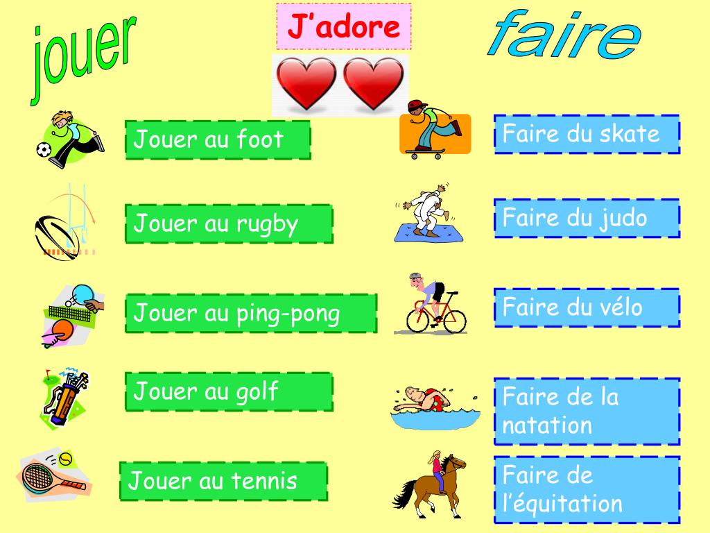 faire jouer J’adore Faire du skate Jouer au foot Faire du judo Jouer aurugby Faire du vélo Jouer auping-pong Jouer augolf Faire de la natation Faire de l’équitation Jouer autennis