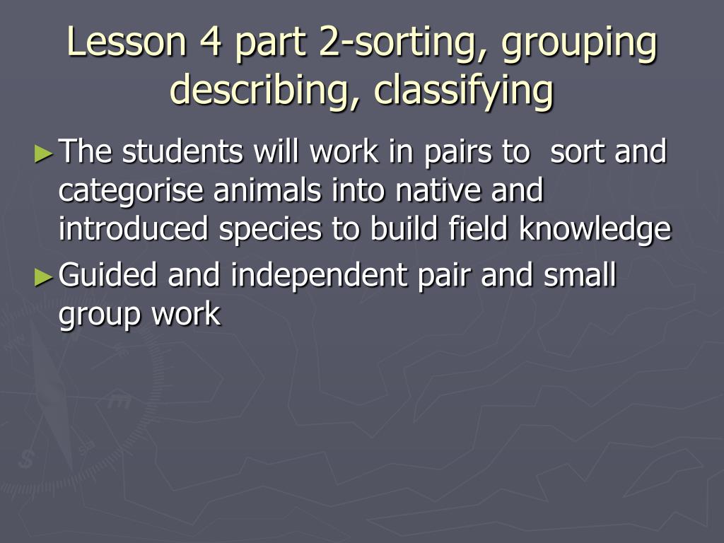 Lesson 4 part 2-sorting, grouping describing, classifying • The students will work in pairs to sort and categorise animals into native and introduced species to build field knowledge • Guided and independent pair and small group work