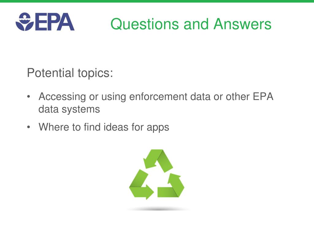 Questions and Answers Potential topics: • Accessing or using enforcement data or other EPA data systems • Where to find ideas for apps