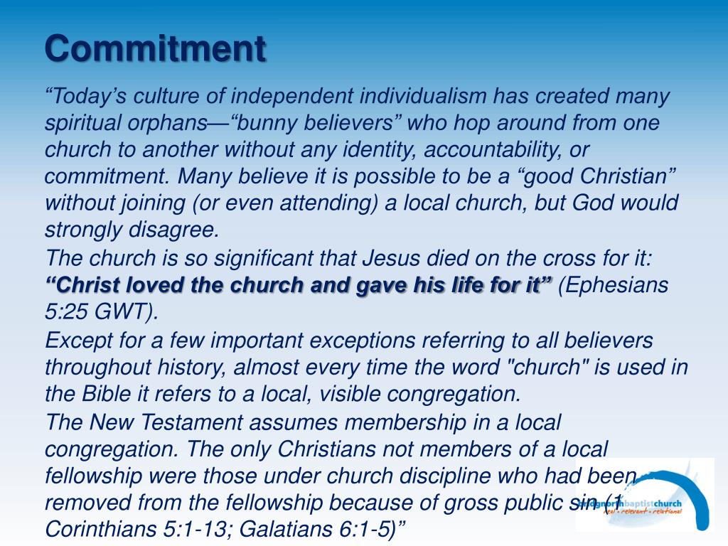 Commitment “Today’s culture of independent individualism has created many spiritual orphans—“bunny believers” who hop around from one church to another without any identity, accountability, or commitment. Many believe it is possible to be a “good Christian” without joining (or even attending) a local church, but God would strongly disagree. The church is so significant that Jesus died on the cross for it: “Christ loved the church and gave his life for it” (Ephesians 5:25 GWT). Except for a few important exceptions referring to all believers throughout history, almost every time the word "church" is used in the Bible it refers to a local, visible congregation. The New Testament assumes membership in a local congregation. The only Christians not members of a local fellowship were those under church discipline who had been removed from the fellowship because of gross public sin (1 Corinthians 5:1-13; Galatians 6:1-5)” – Rick Warren