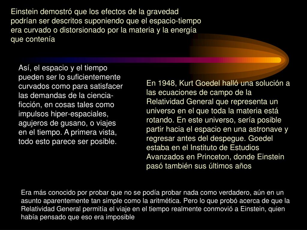 Einstein demostró que los efectos de la gravedad podrían ser descritos suponiendo que el espacio-tiempo era curvado o distorsionado por la materia y la energía que contenía Así, el espacio y el tiempo pueden ser lo suficientemente curvados como para satisfacer las demandas de la ciencia-ficción, en cosas tales como impulsos hiper-espaciales, agujeros de gusano, o viajes en el tiempo. A primera vista, todo esto parece ser posible. En 1948, Kurt Goedel halló una solución a las ecuaciones de campo de la Relatividad General que representa un universo en el que toda la materia está rotando. En este universo, sería posible partir hacia el espacio en una astronave y regresar antes del despegue. Goedel estaba en el Instituto de Estudios Avanzados en Princeton, donde Einstein pasó también sus últimos años Era más conocido por probar que no se podía probar nada como verdadero, aún en un asunto aparentemente tan simple como la aritmética. Pero lo que probó acerca de que la Relatividad General permitía el viaje en el tiempo realmente conmovió a Einstein, quien había pensado que eso era imposible