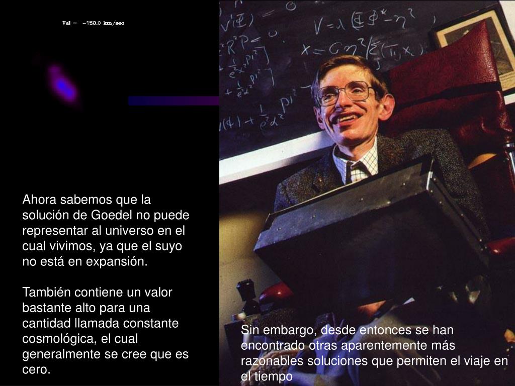 Ahora sabemos que la solución de Goedel no puede representar al universo en el cual vivimos, ya que el suyo no está en expansión. También contiene un valor bastante alto para una cantidad llamada constante cosmológica, el cual generalmente se cree que es cero. Sin embargo, desde entonces se han encontrado otras aparentemente más razonables soluciones que permiten el viaje en el tiempo
