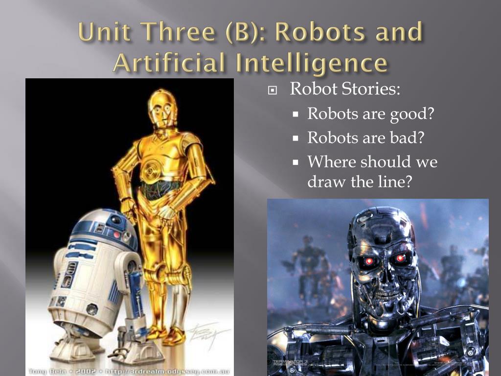 Unit Three (B): Robots and Artificial Intelligence • Robot Stories: • Robots are good? • Robots are bad? • Where should we draw the line?