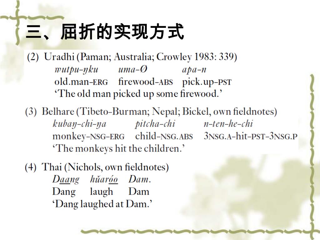 二、屈折的基本类型 混合型 Choctaw语(美洲印第安语) 作格应用条件:代词、状态不及物动词