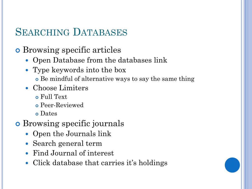 Searching Databases • Browsing specific articles • Open Database from the databases link • Type keywords into the box • Be mindful of alternative ways to say the same thing • Choose Limiters • Full Text • Peer-Reviewed • Dates • Browsing specific journals • Open the Journals link • Search general term • Find Journal of interest • Click database that carries it’s holdings