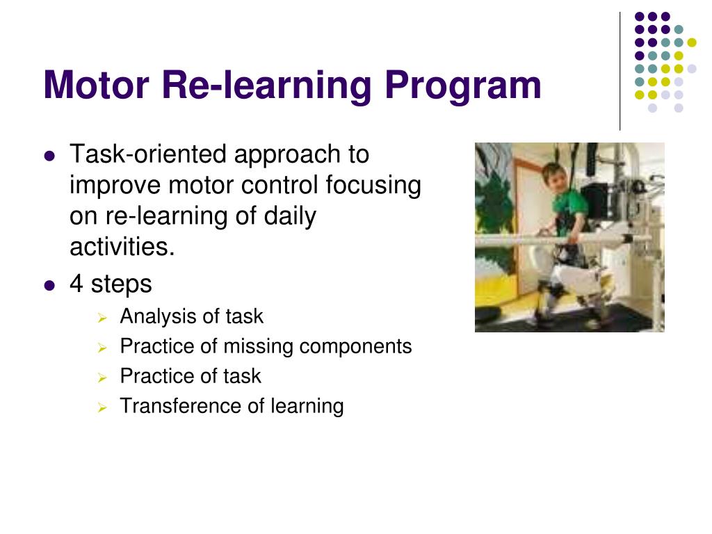 Motor Re-learning Program • Task-oriented approach to improve motor control focusing on re-learning of daily activities. • 4 steps • Analysis of task • Practice of missing components • Practice of task • Transference of learning