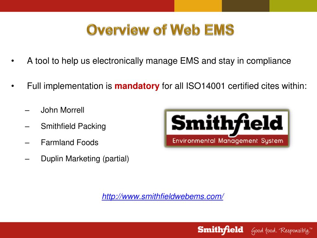 Overview of Web EMS • A tool to help us electronically manage EMS and stay in compliance • Full implementation is mandatory for all ISO14001 certified cites within: • John Morrell • Smithfield Packing • Farmland Foods • Duplin Marketing (partial) http://www.smithfieldwebems.com/