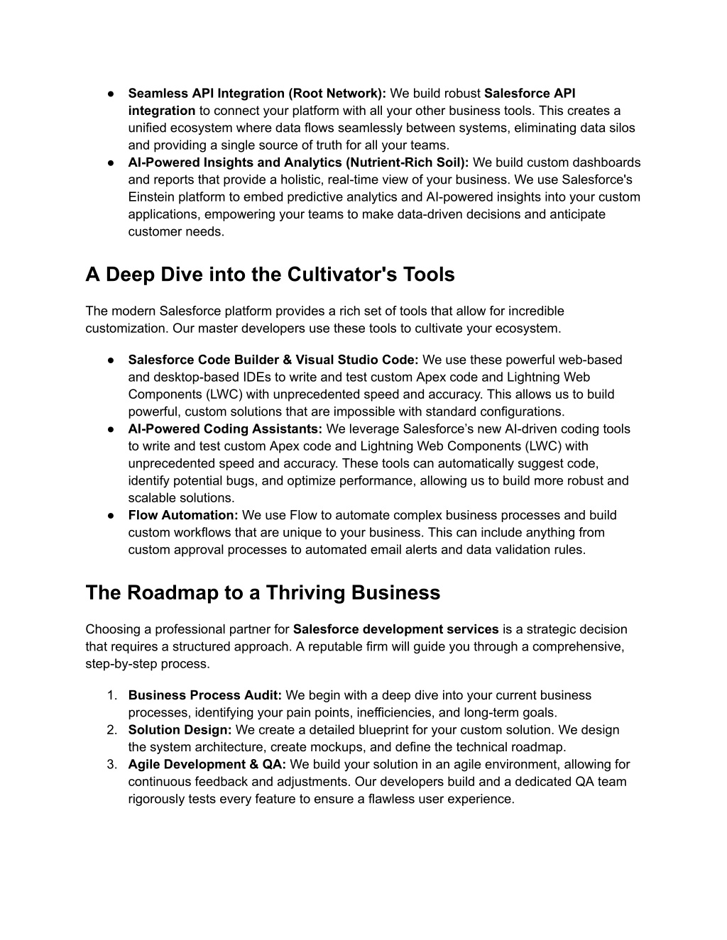 ● Seamless API Integration (Root Network): We build robust Salesforce API integration to connect your platform with all your other business tools. This creates a unified ecosystem where data flows seamlessly between systems, eliminating data silos and providing a single source of truth for all your teams. ● AI-Powered Insights and Analytics (Nutrient-Rich Soil): We build custom dashboards and reports that provide a holistic, real-time view of your business. We use Salesforce's Einstein platform to embed predictive analytics and AI-powered insights into your custom applications, empowering your teams to make data-driven decisions and anticipate customer needs. A Deep Dive into the Cultivator's Tools The modern Salesforce platform provides a rich set of tools that allow for incredible customization. Our master developers use these tools to cultivate your ecosystem. ● Salesforce Code Builder & Visual Studio Code: We use these powerful web-based and desktop-based IDEs to write and test custom Apex code and Lightning Web Components (LWC) with unprecedented speed and accuracy. This allows us to build powerful, custom solutions that are impossible with standard configurations. ● AI-Powered Coding Assistants: We leverage Salesforce’s new AI-driven coding tools to write and test custom Apex code and Lightning Web Components (LWC) with unprecedented speed and accuracy. These tools can automatically suggest code, identify potential bugs, and optimize performance, allowing us to build more robust and scalable solutions. ● Flow Automation: We use Flow to automate complex business processes and build custom workflows that are unique to your business. This can include anything from custom approval processes to automated email alerts and data validation rules. The Roadmap to a Thriving Business Choosing a professional partner for Salesforce development services is a strategic decision that requires a structured approach. A reputable firm will guide you through a comprehensive, step-by-step process. 1. Business Process Audit: We begin with a deep dive into your current business processes, identifying your pain points, inefficiencies, and long-term goals. 2. Solution Design: We create a detailed blueprint for your custom solution. We design the system architecture, create mockups, and define the technical roadmap. 3. Agile Development & QA: We build your solution in an agile environment, allowing for continuous feedback and adjustments. Our developers build and a dedicated QA team rigorously tests every feature to ensure a flawless user experience.