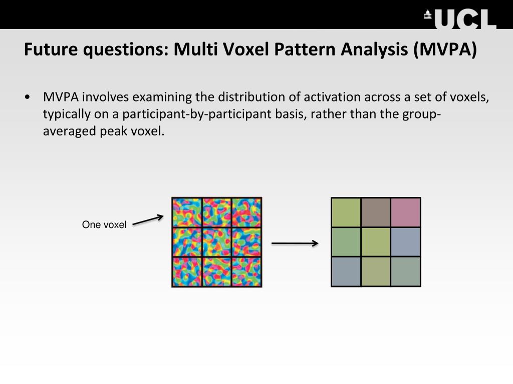 Future questions: Multi Voxel Pattern Analysis (MVPA) One voxel • MVPA involves examining the distribution of activation across a set of voxels, typically on a participant-by-participant basis, rather than the group-averaged peak voxel.