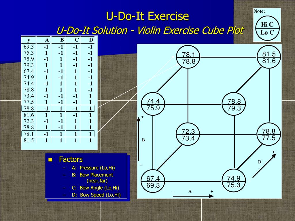 U-Do-It ExerciseU-Do-It Solution - Violin Exercise Cube Plot • Factors • A: Pressure (Lo,Hi) • B: Bow Placement (near,far) • C: Bow Angle (Lo,Hi) • D: Bow Speed (Lo,Hi)