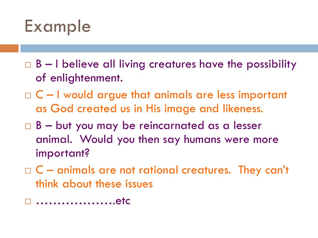 Example • B – I believe all living creatures have the possibility of enlightenment. • C – I would argue that animals are less important as God created us in His image and likeness. • B – but you may be reincarnated as a lesser animal. Would you then say humans were more important? • C – animals are not rational creatures. They can’t think about these issues • ……………….etc