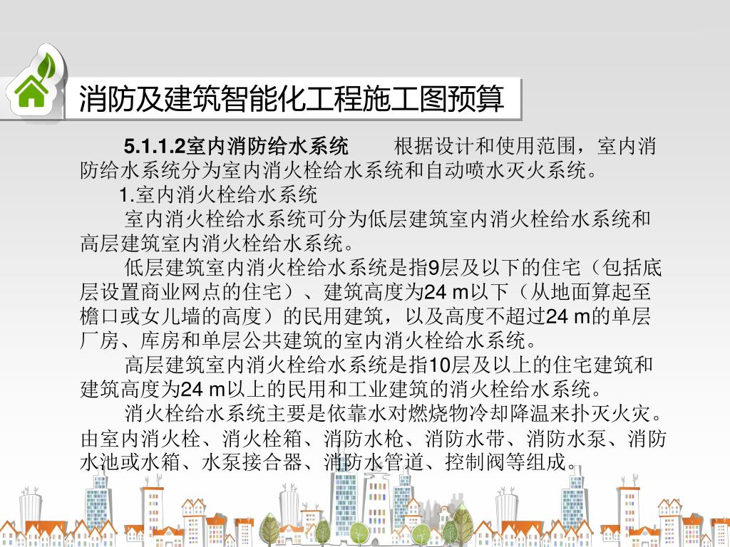 消防及建筑智能化工程施工图预算 知识目标 了解火灾自动报警系统、室内消防给水系统和给水方式及安装技术要求;理解消防给水系统工程施工图的主要内容及其识读方法;掌握消防工程施工图预算编制的步骤、方法、内容、计算规则及其格式。 能力目标 能熟练识读消防给水系统和火灾自动报警系统工程施工图;比较熟练依据合同、设计资料及目标进行消防工程计量与计价;学会根据计量计价结果进行消防工程工料分析、总结、整理各项造价指标。