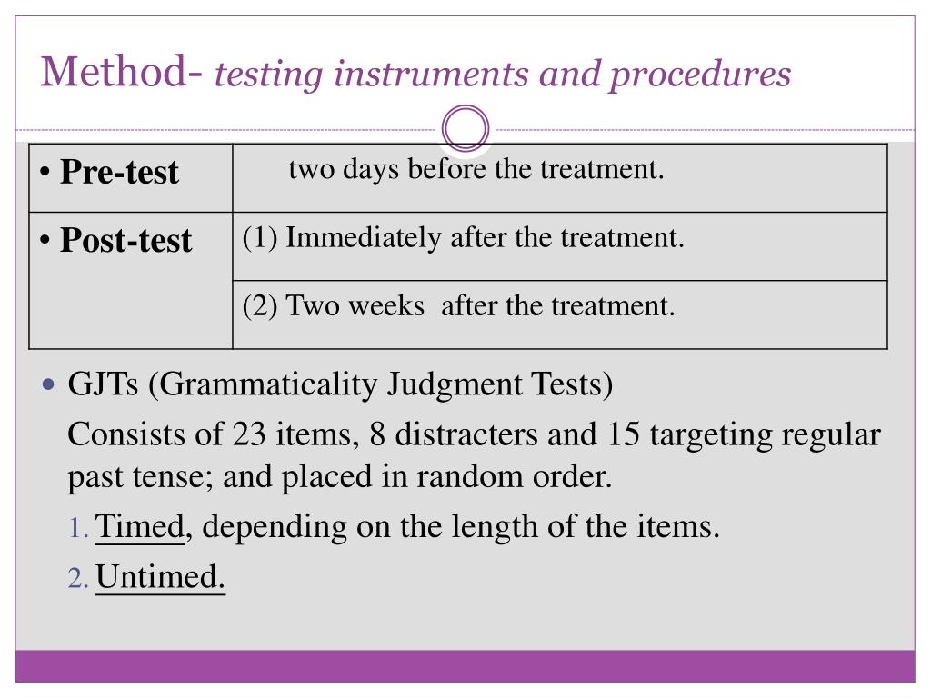 Method- testing instruments and procedures GJTs (Grammaticality Judgment Tests) Consists of 23 items, 8 distracters and 15 targeting regular past tense; and placed in random order. Timed, depending on the length of the items. Untimed.