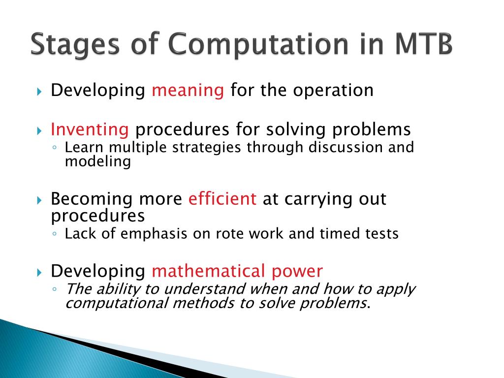 Stages of Computation in MTB • Developing meaning for the operation • Inventing procedures for solving problems • Learn multiple strategies through discussion and modeling • Becoming more efficient at carrying out procedures • Lack of emphasis on rote work and timed tests • Developing mathematical power • The ability to understand when and how to apply computational methods to solve problems.