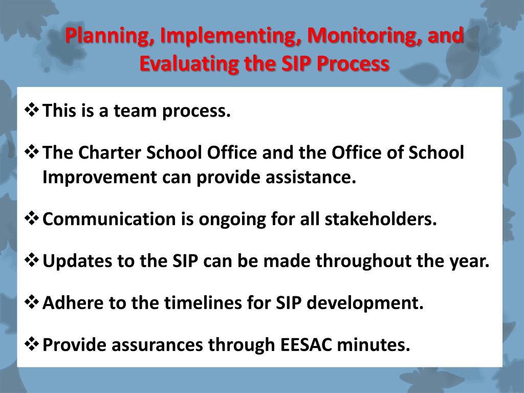 Planning, Implementing, Monitoring, and Evaluating the SIP Process • This is a team process. • The Charter School Office and the Office of School Improvement can provide assistance. • Communication is ongoing for all stakeholders. • Updates to the SIP can be made throughout the year. • Adhere to the timelines for SIP development. • Provide assurances through EESAC minutes.