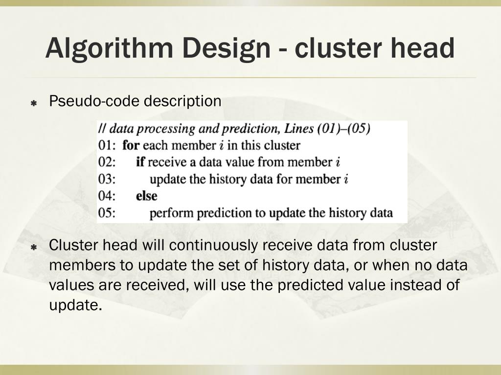 Algorithm Design - cluster head Pseudo-code description Cluster head will continuously receive data from cluster members to update the set of history data, or when no data values are received, will use the predicted value instead of update.