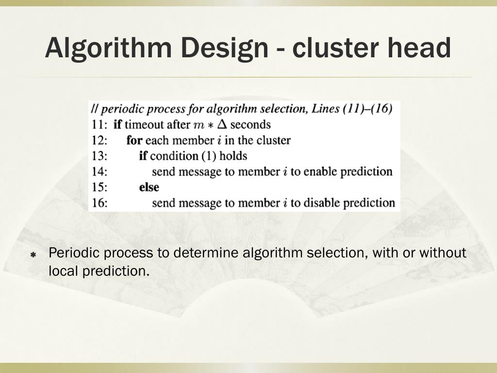 Algorithm Design - cluster head Periodic process to determine algorithm selection, with or without local prediction.