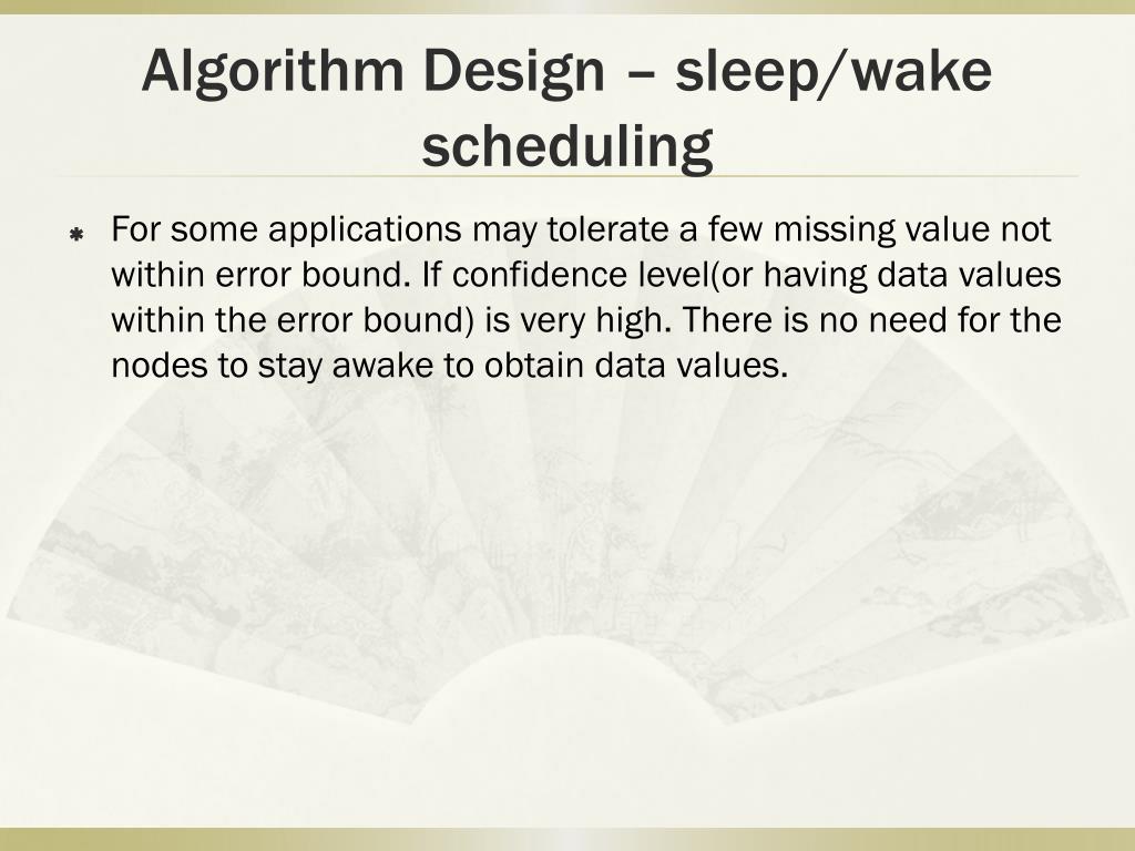 Algorithm Design – sleep/wake scheduling For some applications may tolerate a few missing value not within error bound. If confidence level(or having data values within the error bound) is very high. There is no need for the nodes to stay awake to obtain data values.