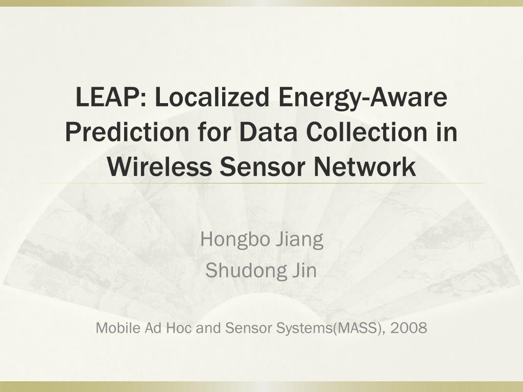 LEAP: Localized Energy-Aware Prediction for Data Collection in Wireless Sensor Network. Hongbo Jiang Shudong Jin Mobile Ad Hoc and Sensor Systems(MASS), 2008. Outline. Introduction Model selection Prediction model Energy-efficient algorithm Algorithm design Experiment results Conclusion.