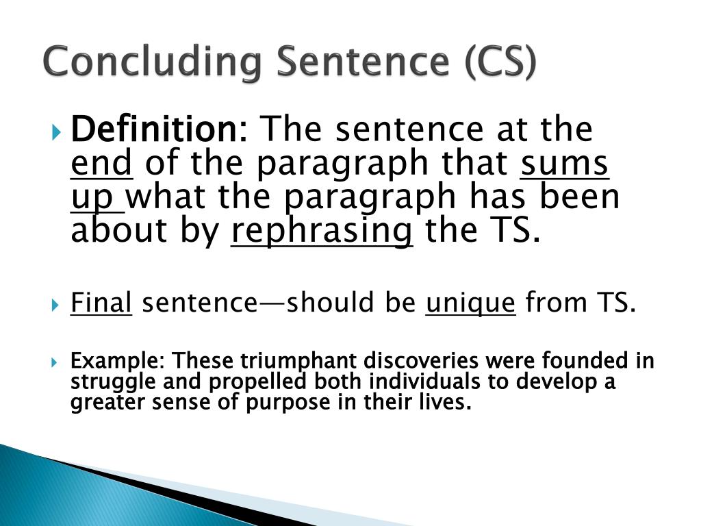 Concluding Sentence (CS) • Definition: The sentence at the end of the paragraph that sums up what the paragraph has been about by rephrasing the TS. • Final sentence—should be unique from TS. • Example: These triumphant discoveries were founded in struggle and propelled both individuals to develop a greater sense of purpose in their lives.