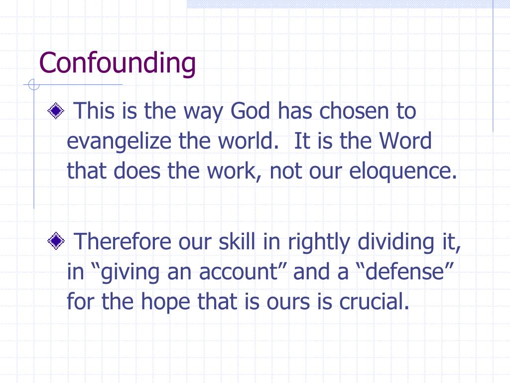 Confounding • This is the way God has chosen to evangelize the world. It is the Word that does the work, not our eloquence. • Therefore our skill in rightly dividing it, in “giving an account” and a “defense” for the hope that is ours is crucial.