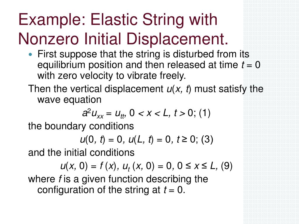 Example: Elastic String with Nonzero Initial Displacement. First suppose that the string is disturbed from its equilibrium position and then released at time t = 0 with zero velocity to vibrate freely. Then the vertical displacement u(x, t) must satisfy the wave equation a2uxx= utt, 0 < x < L, t > 0; (1) the boundary conditions u(0, t) = 0, u(L, t) = 0, t ≥ 0; (3) and the initial conditions u(x, 0) = f (x), ut(x, 0) = 0, 0 ≤ x ≤ L, (9) where f is a given function describing the configuration of the string at t = 0.