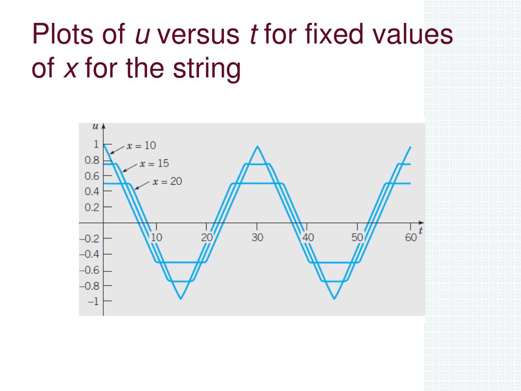 Section 9.7 The Wave Equation: Vibrations of an Elastic String The classical wave equation that describes the vibrations of an elastic string of length L is a2uxx= utt, 0 < x < L, t > 0, where u(x, t) represents the string’s displacement from equilibrium at time t and position x along the string. Initial and boundary conditions are given. Solved by method of separation of variables. Defined modal shape and natural frequency.