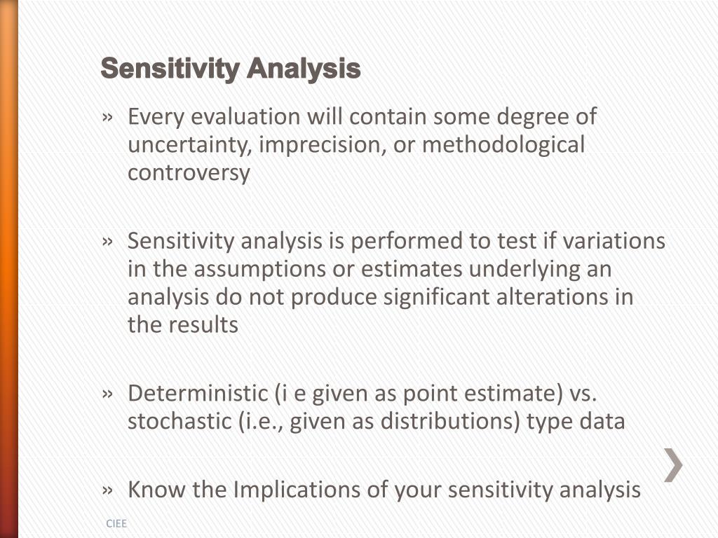 Sensitivity Analysis • Every evaluation will contain some degree of uncertainty, imprecision, or methodological controversy • Sensitivity analysis is performed to test if variations in the assumptions or estimates underlying an analysis do not produce significant alterations in the results • Deterministic (i e given as point estimate) vs. stochastic (i.e., given as distributions) type data • Know the Implications of your sensitivity analysis CIEE