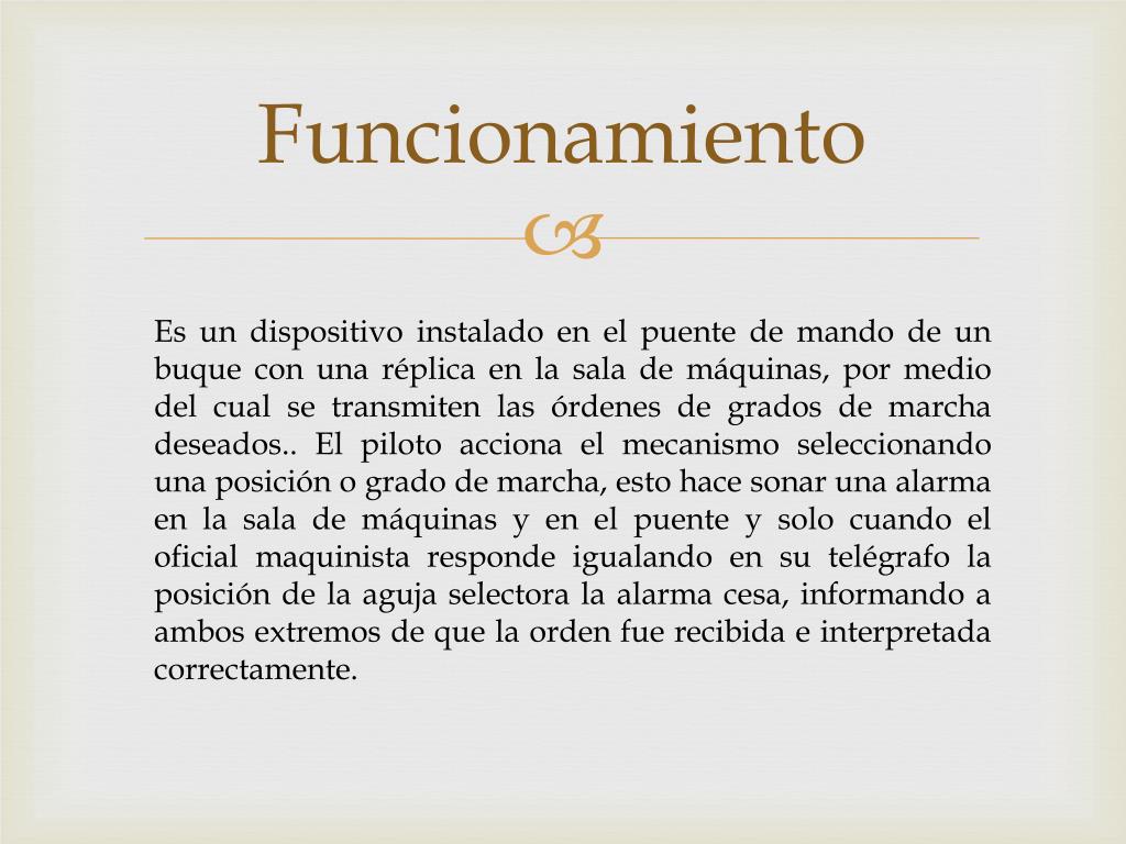 Funcionamiento Es un dispositivo instalado en el puente de mando de un buque con una réplica en la sala de máquinas, por medio del cual se transmiten las órdenes de grados de marcha deseados.. El piloto acciona el mecanismo seleccionando una posición o grado de marcha, esto hace sonar una alarma en la sala de máquinas y en el puente y solo cuando el oficial maquinista responde igualando en su telégrafo la posición de la aguja selectora la alarma cesa, informando a ambos extremos de que la orden fue recibida e interpretada correctamente.