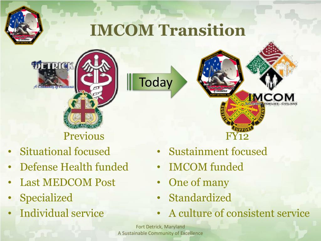 IMCOM Transition Previous • Situational focused • Defense Health funded • Last MEDCOM Post • Specialized • Individual service FY12 • Sustainment focused • IMCOM funded • One of many • Standardized • A culture of consistent service Today Fort Detrick, Maryland A Sustainable Community of Excellence
