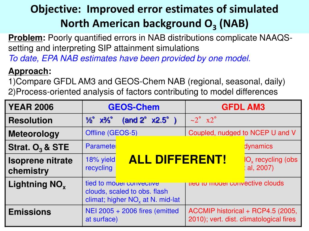 Objective: Improved error estimates of simulated North American background O3 (NAB) • Problem: Poorly quantified errors in NAB distributions complicate NAAQS-setting and interpreting SIP attainment simulations • To date, EPA NAB estimates have been provided by one model. • Approach: • Compare GFDL AM3 and GEOS-Chem NAB (regional, seasonal, daily) • Process-oriented analysis of factors contributing to model differences ALL DIFFERENT!