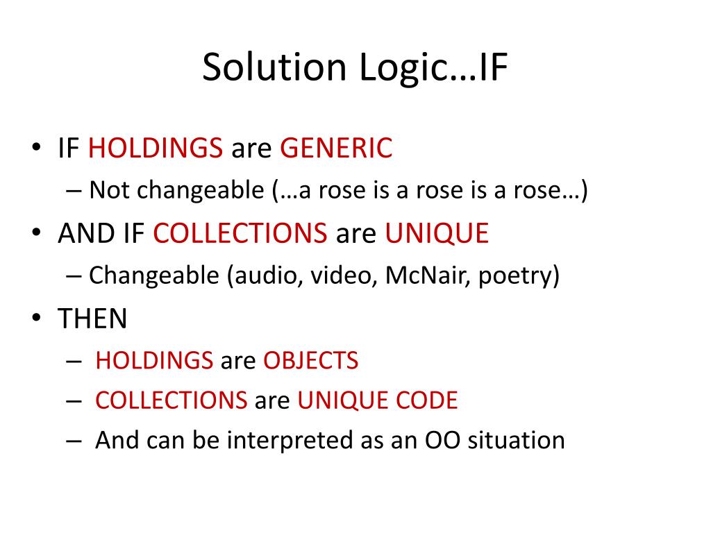 Solution Logic…IF • IF HOLDINGS are GENERIC • Not changeable (…a rose is a rose is a rose…) • AND IF COLLECTIONS are UNIQUE • Changeable (audio, video, McNair, poetry) • THEN • HOLDINGS are OBJECTS • COLLECTIONS are UNIQUE CODE • And can be interpreted as an OO situation