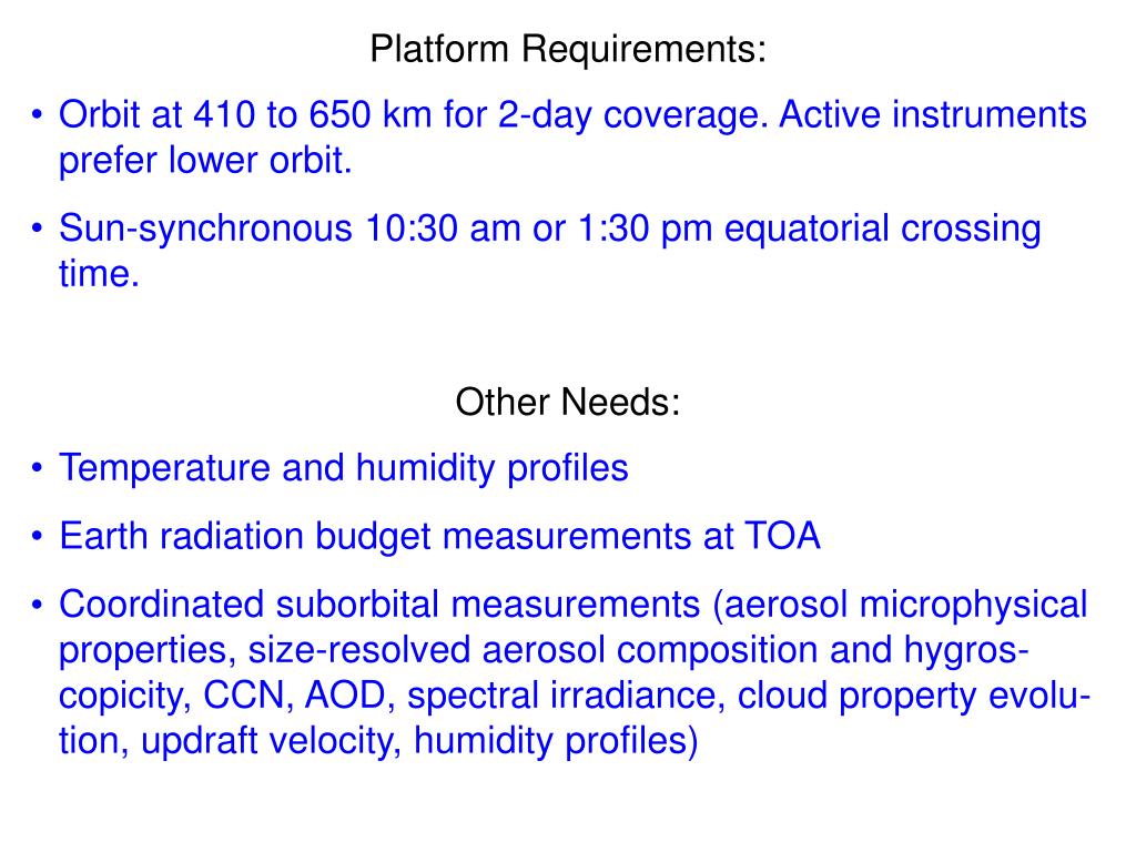 Platform Requirements: • Orbit at 410 to 650 km for 2-day coverage. Active instruments prefer lower orbit. • Sun-synchronous 10:30 am or 1:30 pm equatorial crossing time. Other Needs: • • Temperature and humidity profiles • • Earth radiation budget measurements at TOA • Coordinated suborbital measurements (aerosol microphysical properties, size-resolved aerosol composition and hygros-copicity, CCN, AOD, spectral irradiance, cloud property evolu-tion, updraft velocity, humidity profiles)