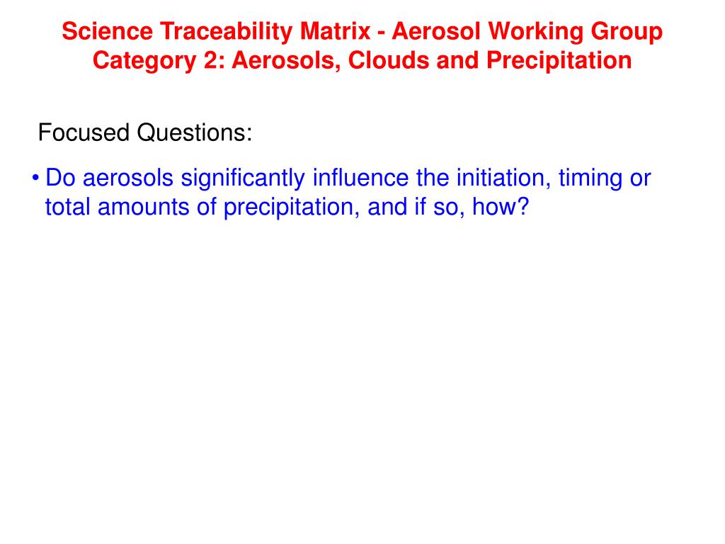Science Traceability Matrix - Aerosol Working Group Category 2: Aerosols, Clouds and Precipitation Focused Questions: • Do aerosols significantly influence the initiation, timing or total amounts of precipitation, and if so, how?