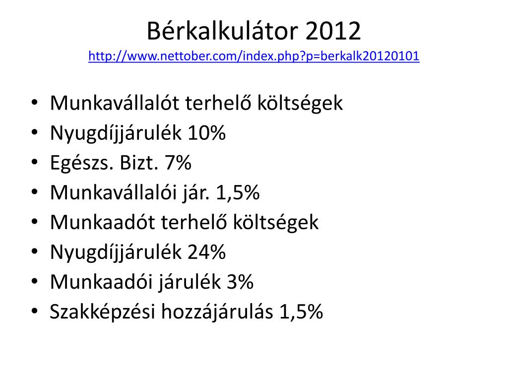 Bérkalkulátor 2012http://www.nettober.com/index.php?p=berkalk20120101 • Munkavállalót terhelő költségek • Nyugdíjjárulék 10% • Egészs. Bizt. 7% • Munkavállalói jár. 1,5% • Munkaadót terhelő költségek • Nyugdíjjárulék 24% • Munkaadói járulék 3% • Szakképzési hozzájárulás 1,5%